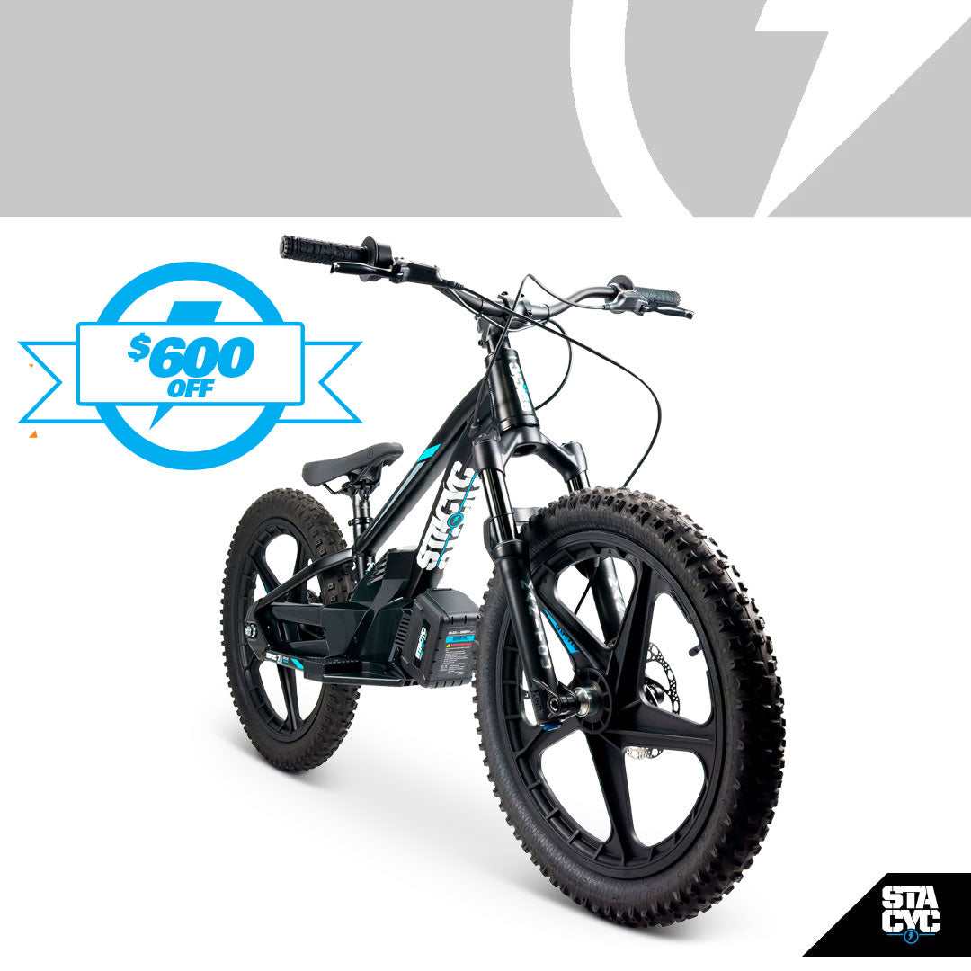 This is the top choice for the STACYC GENERATION and ready to deliver a whole new riding experience. With 3 power modes the 20eDRIVE will still allow the progression your little rippers expect from STACYC with a much larger growth curve. A top speed of 20-MPH, and dressed with MANITOU J-Unit front forks and hydraulic disc brakes the STACYC 20eDRIVE has the ability to unlock endless opportunities and develop the skills your little rippers have dreamed of.